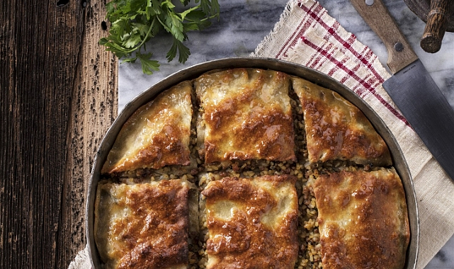İç Harcı:Bulguru 2.5 su bardağı sıcak su ile suyunu çekinceye kadar yaklaşık 15dakika haşlayın.İnce doğranmış soğanı yağda pembeleşinceye kadar (5 dakika) kavurun.Sırayla kavurma (kıyma ile yapılacak ise kıyma konup kavrulduktan sonra diğer malzemeler ilave edilir) bulgur, maydanoz, tuz ve baharatları katıp iyice karıştırın. 6 eşit parçaya ayırın. Hamur:Bir kapta un, tuz ve ılık su ile sert bir hamur yoğurun,7 bezeye ayırıp (böreğin içinin iyi pişmesi için, en üste koyulacak bezeyi biraz büyük tutun) dinlendirin.Her bezeyi 1-2 mm incelikte açın. Yuvarlak 40 cm çapındaki tepsiyi yağlayın.Altı için açılan yufkayı serip, üzerine iç koyun. Yufka iç olmak üzere her kata hazırlanan iç malzemesinden koyup açılan yufkaları üst üste yerleştirin.Üst için büyük tutulan bezeyi diğerlerinden biraz kalın açarak, En üste serip üzerini iyice yağlayın. Dilimleyip 200 derece ısıtılmış fırında altı ve üstü kızarıncaya kadar (içinin iyi pişmesi için) yaklaşık 1 saat pişirin. Afiyet olsun!