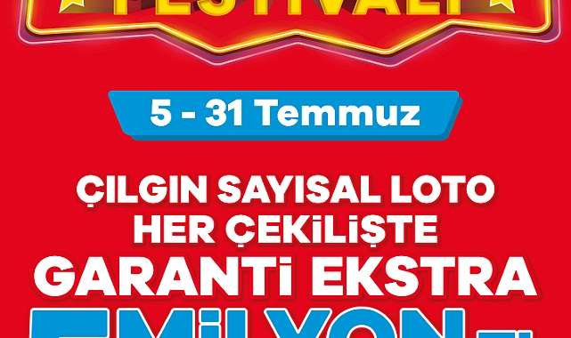 Çılgın Sayısal Loto “Milyonerler Festivali” boyunca garanti 60 milyon TL ekstra ikramiye kazandıracak! Çılgın Sayısal Loto’da 5-31 Temmuz tarihleri arasındaki çekilişler oyunseverlerin şansına şans katacak ve her çekiliş garanti, ekstra 5 milyon TL ikramiye kazandıracak. “Milyonerler Festivali” boyunca yapılacak 12 Çılgın Sayısal Loto çekilişinde, oyunseverlere ekstra 60 milyon TL’lik ikramiye dağıtılacak. Çılgın Sayısal Loto’da “Milyonerler Festivali” oyunseverleri bekliyor. Milyonerler Festivali kapsamında, 5-31 Temmuz tarihleri arasında gerçekleşecek her Çılgın Sayısal Loto çekilişinde oyunseverler garanti ekstra 5 milyon TL kazanacak. Bu tarihler arasındaki 12 çekilişle dağıtılacak toplam ekstra ikramiye ise 60 milyon TL olacak.