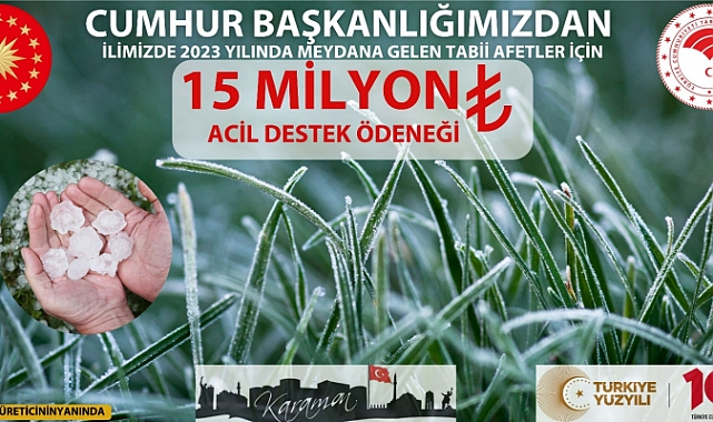 2023 yılı üretim sezonu içerisinde Karaman il merkez ve ilçelerinde meydana gelen tabi afetler nedeniyle bitkisel üretimleri ile canlı hayvan varlıkları zarar gören ve Karaman İl Tarım ve Orman Müdürlüğü ve İlçe Müdürlükleri Teknik personelleri tarafından tespitleri yapılan üreticilerimiz için Cumhurbaşkanlığı İdari İşler Başkanlığı tarafından İlimize 15 Milyon TL Acil Destek Ödeneği gönderilmiştir. Söz konusu ödenek ile afetlerden zarar gören üreticilerimize tarımsal girdi desteği verilecektir.