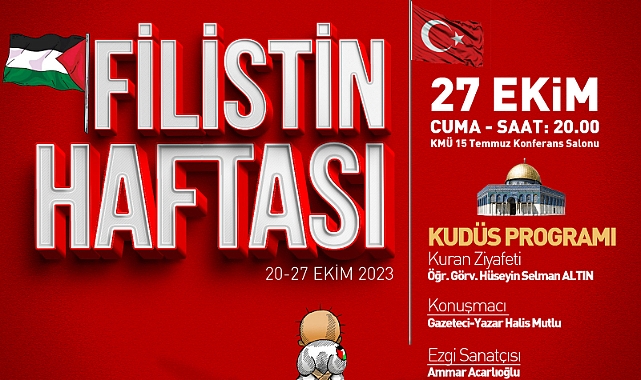 20-27 Ekim tarihleri arasında Filistin odaklı bir dizi etkinlik planlayıp gerçekleştiren Karaman STK Platformu bu etkinlikleri Kudüs Gecesi ile taçlandırıyor. KMÜ 15 Temmuz Konferans Salonunda düzenlenecek olan program Öğr. Gör. Hüseyin Selman Altın’ın Kur’an tilâvetiyle başlayacak. Araştırmacı-Gazeteci Halis Mutlu’nun konuşmacı olarak katılacağı programda Ses Sanatçısı Ammar Acarlıoğlu da ezgileriyle yer alacak. Kudüs konulu sinevizyonların gösterileceği gecede başta Filistin olmak üzere tüm dünya mazlumları için dua yapılacak.