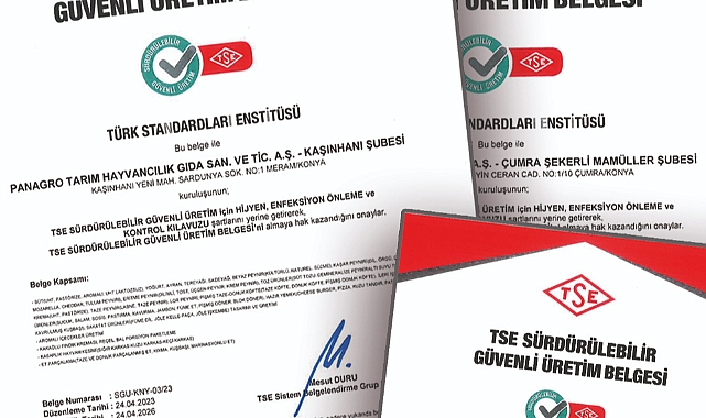 PANAGRO tarım ve hayvancılık et ve süt entegre tesislerimiz ; Süt (UHT,Pastörize, aromalı, UHT laktozsuz, yoğurt, ayran, tereyağı, sade yağ, beyaz peynir, kaşar peyniri çeşitleri, eritme peynir çeşitleri, toz ürünler, krema, pişmiş taze-donuk köfte, ileri işlenmiş et ürünleri (sucuk, salam, pastırma, sosis, kavurma, döner), hazır yemek (cheese burger, pizza, kuzu tandır, patatesli kavrulmuş kuşbaşı), sakatat ürünleri, aromalı içecekler üretimi, reçel, bal, porsiyon paketleme, kasaplık hayvan kesimi (sığır, kuzu, keçi karkas), et, kıyma, kuşbaşı, et parçalamada güvenli, hijyen, enfeksiyon önleme ve kontrol kılavuzu şartlarını yerine tam olarak getirmesinden dolayı; TSE tarafından bu belgeler kurumumuza verilmiştir. Kaliteden taviz vermeden üretmeyi sürdüreceğiz. Gıda arzında güvenin sigortası olmaya devam edeceğiz. Çiftçilerimizle, çalışanlarımızla Türkiye’nin üreten gücü olarak, birlik ve beraberlikle, yerli üretim için güçlü bir şekilde büyüyeceğiz. Halkımızın güvenli gıdaya ulaşması konusunda şu ana kadar yaptığımız tüm çalışmalarımızı da titizlik ve sorumlulukla yerine getirmeye devam edeceğiz.”